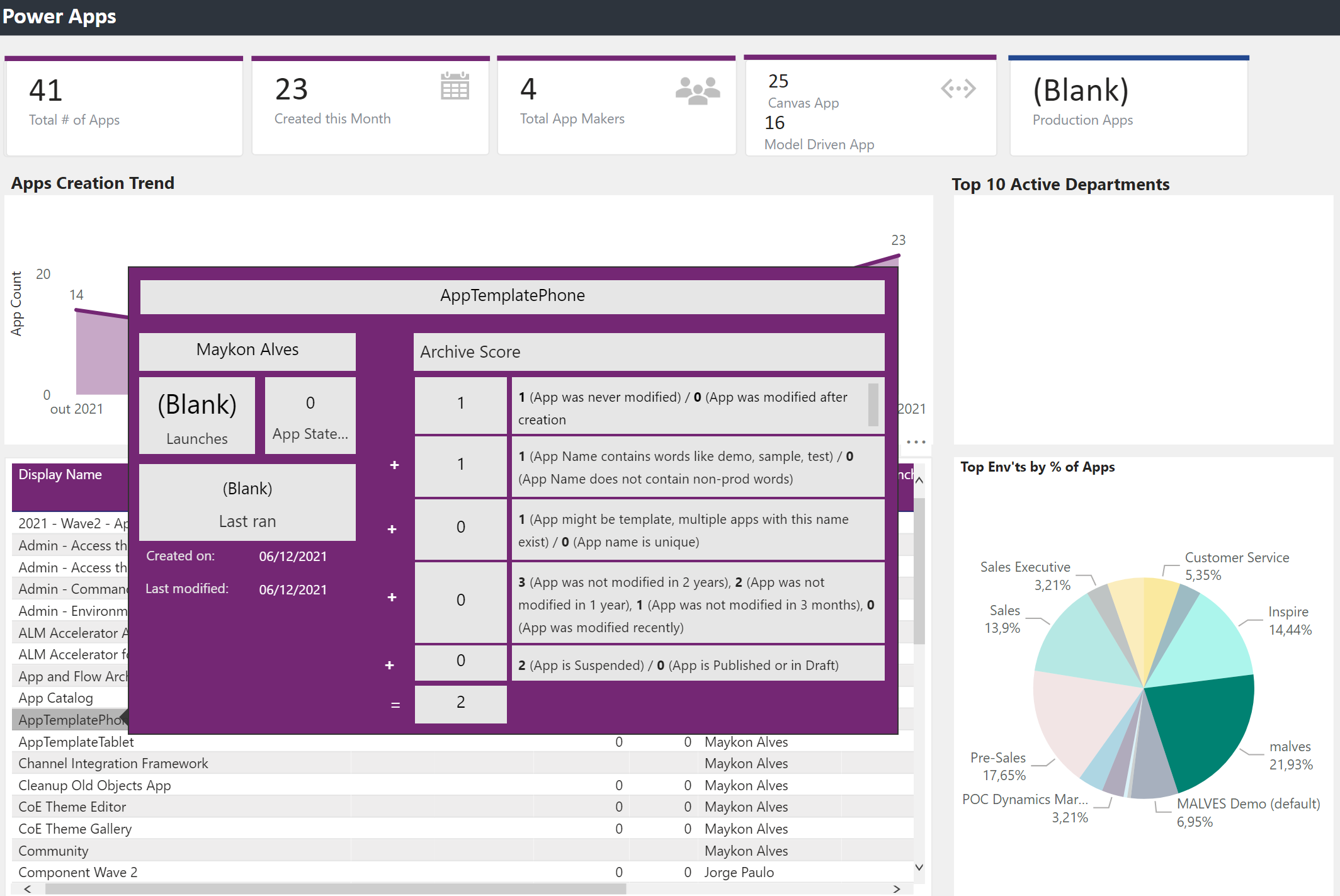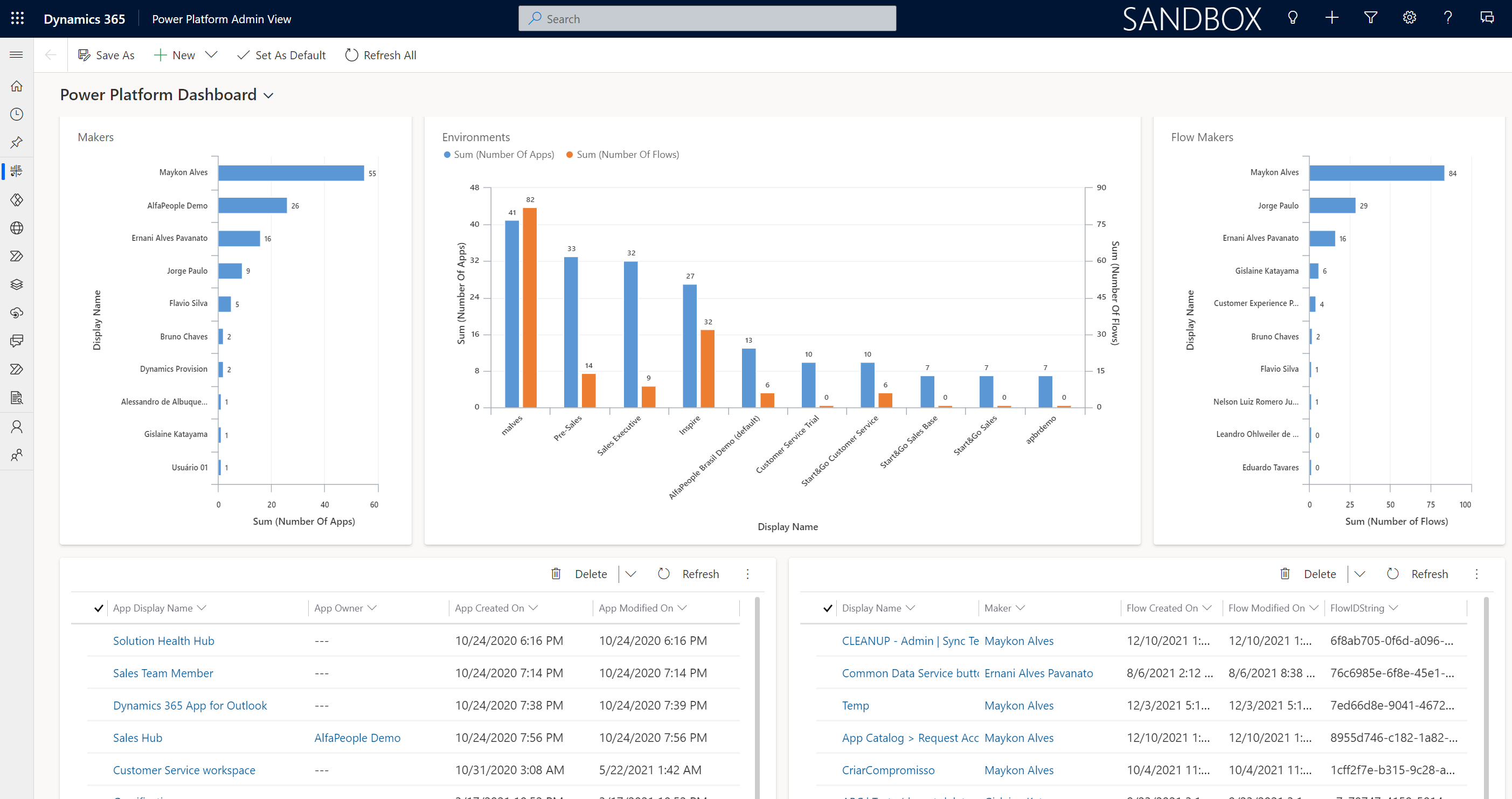 Do you remember one of our questions? “How many App Makers do the organization have?”. The section Makers gives the answer! Besides that, you have how many Apps, Cloud Flows, Desktop Flows, and ChatBots by Makers and departments. Based on this view, you may even nominate the maker as Power Makers according to the quantity of the component they’ve created.