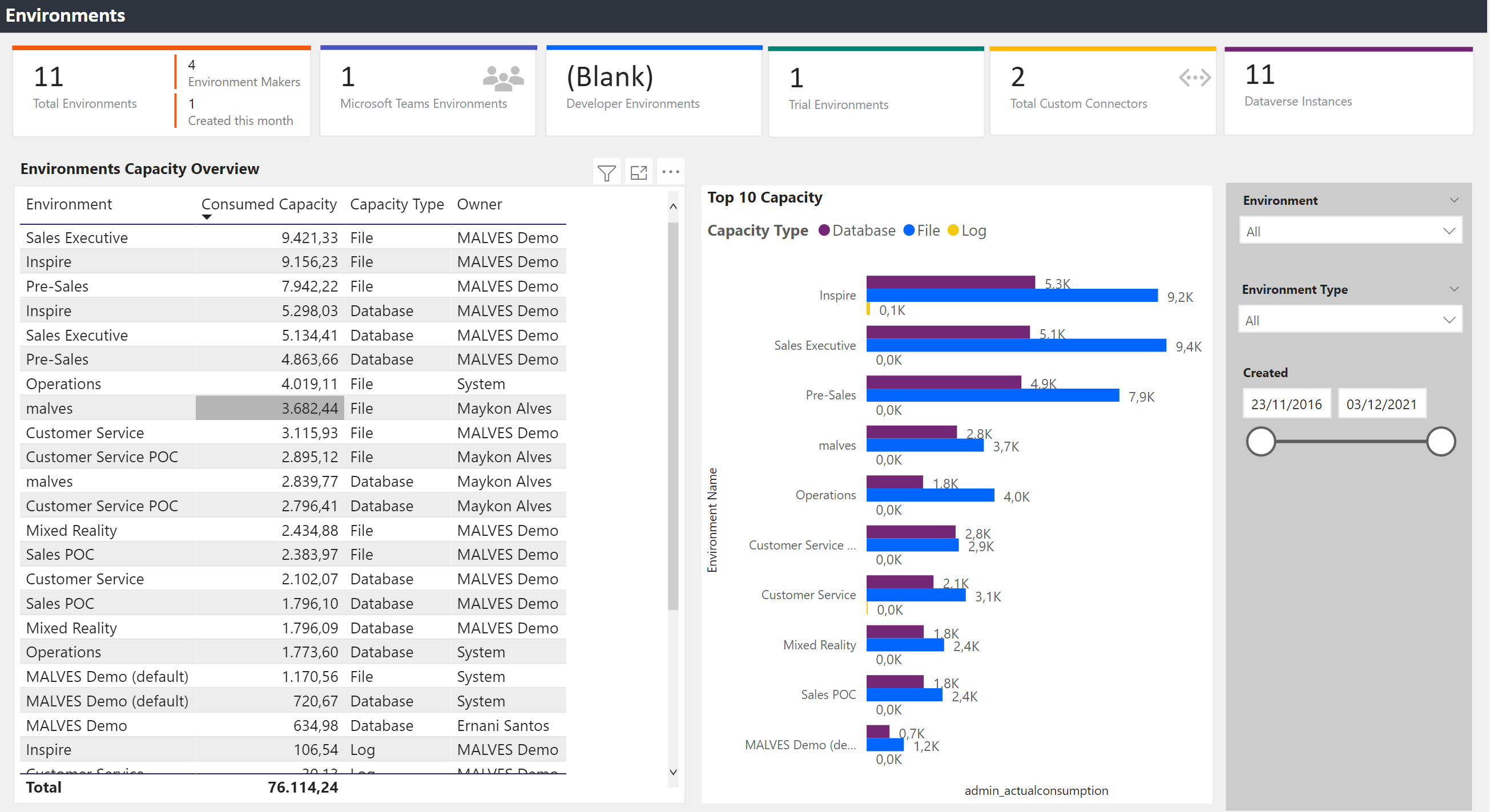 Also, the dashboards provide you with the Environment capacity overview and the environments that consume more space on the tenant.
